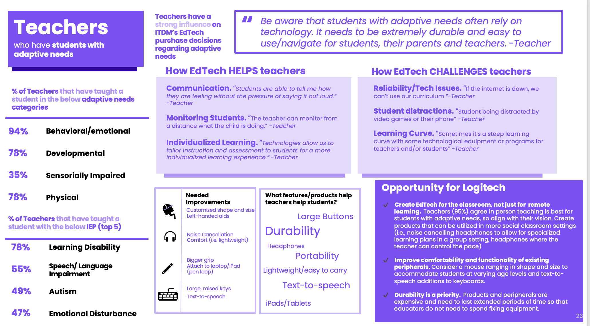 Almost 100% of teachers have taught students with some form of a disability. Despite these statistics, few educational-support products exist that serve both neurotypical and neurodivergent students. Inclusive design can be used as a strategy for business growth as it broadens a single product’s target’s user base. However, this concept had yet to be sold into Logitech’s leadership team.