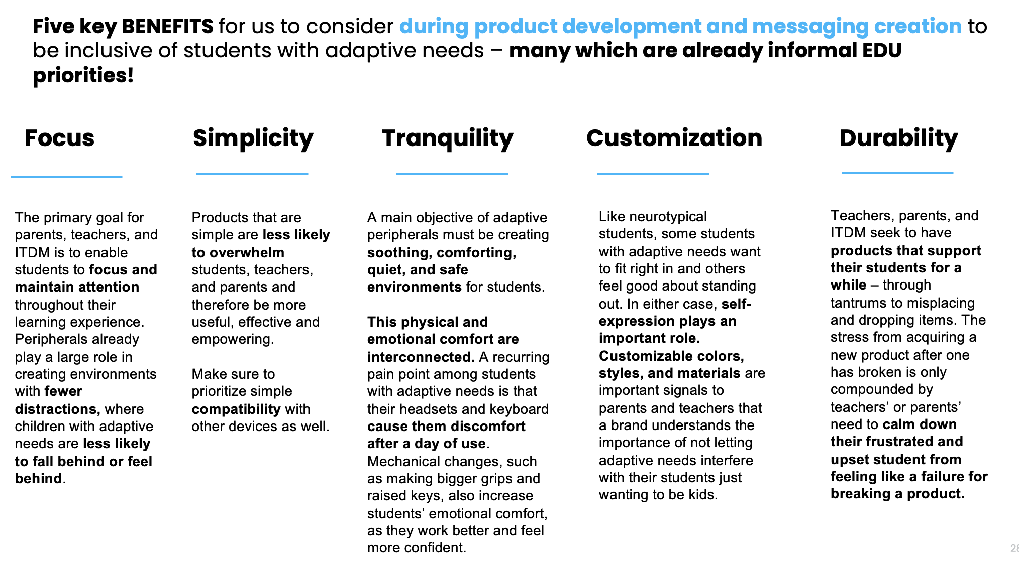 Multi-Methods Research: I wrote surveys, conducted all interviews with students, and performed desk research on the adaptive needs landscape